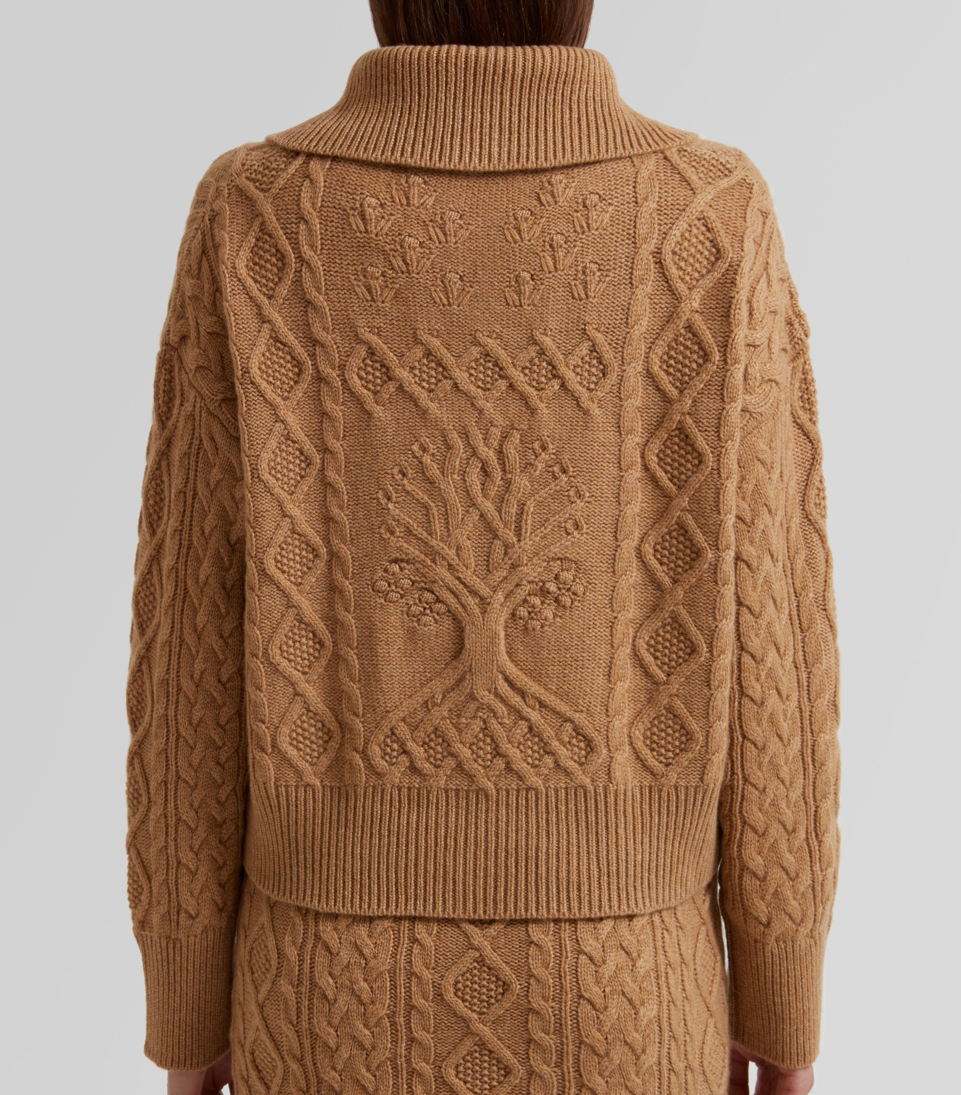 Crafted from spun cashmere, this mid-weight cardigan showcases a tree motif symbolizing the heritage of the Vernoy name.